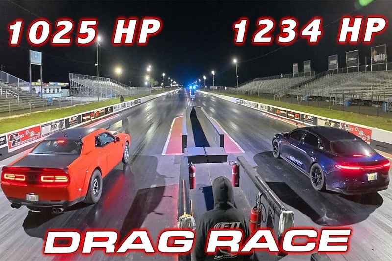 البته این یک چلنجر معمولی نیست؛ این مدل تولید محدود دیمن ۱۷۰ است که در برابر پرچمدار لوسید ایر سافایر قرار گرفته یعنی خودرویی که اکثر سوپراسپرتها را در 400 متر شرمنده کرده است. حال دیمن 170 وارد میدان شده با درسهایی به این خودروی الکتریکی بدهد. نتایج تستها کاملاً نشاندهنده پتانسیل این رقابت رؤیایی بین پیشرانه بنزینی و الکتریکی است. دیمن ۱۷۰ با رنگ نارنجی و کاپوت مشکی در اولین تلاش خود زمان ۹.۱ ثانیه را ثبت کرد درحالیکه لوسید با زمان بهتر ۸.۹۸ ثانیه پیشتاز شد. بااینحال، رقابت آنقدر نزدیک بود که هرگونه عدم تمرکز راننده میتوانست نتیجه را تغییر دهد. بعداً در خنکی شب، آنها برای نبرد اصلی به پیست بردنتون بازگشتند و دقیقاً همین اتفاق افتاد. راننده لوسید با زمان واکنش فوقالعاده ۰.۰۰۴ ثانیه و عملکرد بهتر در 20 متر اولیه، دیمن ۱۷۰ را که رانندهاش تمرکز کافی نداشت، با اختلاف شکست داد و تایم ۹.۱ ثانیه را در برابر ۹.۶ ثانیه دوج ثبت کرد.