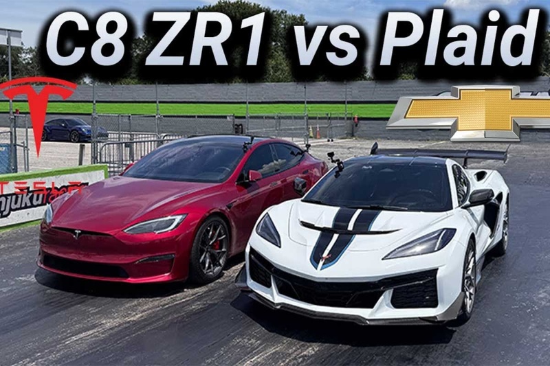 روی کاغذ، ZR1 با نسبت قدرت به وزن بهتر، برتری دارد اما مسابقهٔ درگ روی کاغذ برگزار نمیشود. بهترین زمان کوروت در این رقابت 9.86 ثانیه بود که رقم بسیار چشمگیری است ولی برای شکست دادن تسلا کافی نبود. مدل S پلد با خشم خاموش همیشگیاش شروع کرد و 400 متر را با زمان خیرهکنندهٔ 9.24 ثانیه یعنی بیش از نیم ثانیه سریعتر از کوروت به پایان رساند. همچنین چون راننده به کوروت زمان کافی برای خنک شدن نداد، ZR1 بیشازحد داغ شد و در درگهای بعدی زمانهایی در محدوده 10 ثانیه ثبت کرد.